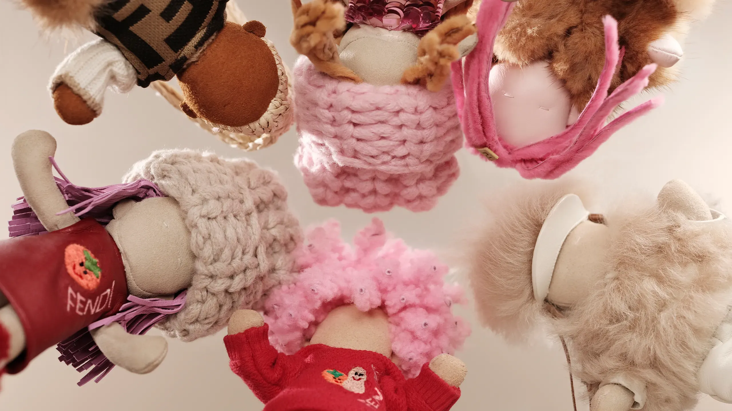 本季系列展現了一種精準的二元辯證,經典 FF 針織衫透過粉紅與亮黃的撞色飾邊,建立起理性的視覺支撐結構;而這份理性隨即被配飾的玩心打破——BFF 掛飾將「好柿花生」的東方寓意,轉譯為皮革與水貂毛的微型雕塑,讓幸運不再是虛無的迷信,而是指尖可觸碰的溫潤實體。,FENDI 將傳統符號拆解,再以當代語彙重新組裝,讓時尚回歸生活,成為承載情感的流動居所。